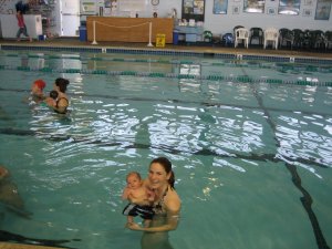 Thomas started swim lessons about one month ago. The Clairemont Boys and Girls Club through a program called Aqua Pros runs a parent/tot swim class starting at two months. It is a great program that uses verbal cues and praise to help babies learn basic swim skills. My mom took photos but did not know how to use the zoom, so this is the best photo I have.