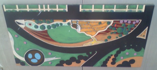 … we stumbled across this painting on the side of one of the utility boxes. Roger was the one who actually identified it as being a map or an early concept of the park. We have been to Bird Park many times to watch friends play football, let the kid run and watch concerts, but we never noticed this painting before.