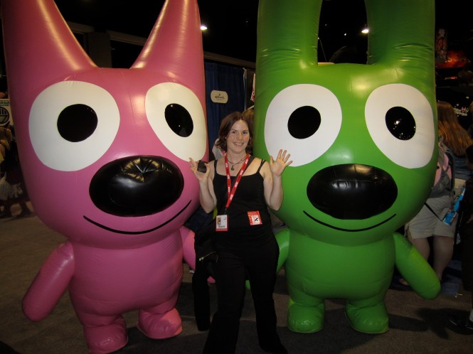Booths rousing my curiosity ranged from the Asian pop culture magazine/toy vendor, Giant Robot…. to the creative Haunted Memories changing portraits… to the simple stick figure drawings of the Kingdom of Loathing role-playing game. As many times as I have sent my family the hilariously funny Hoops and Yoyo greeting cards, it seemed vaguely appropriate to pose for a photo with the life-sized versions and include a link to their amusing Sarcastic Wednesday animated e-card. By the way, they are not so entertaining in real life.
