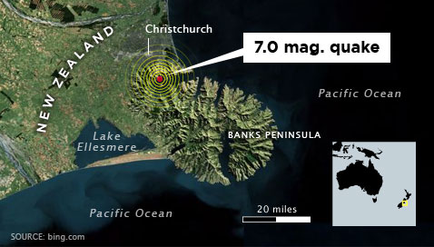 This morning at 4:35 a.m. New Zealand time (in reality tomorrow morning) an earthquake of 7.0 magnitude shook the city of Christchurch causing power outages and building damage but photos currently are limited.