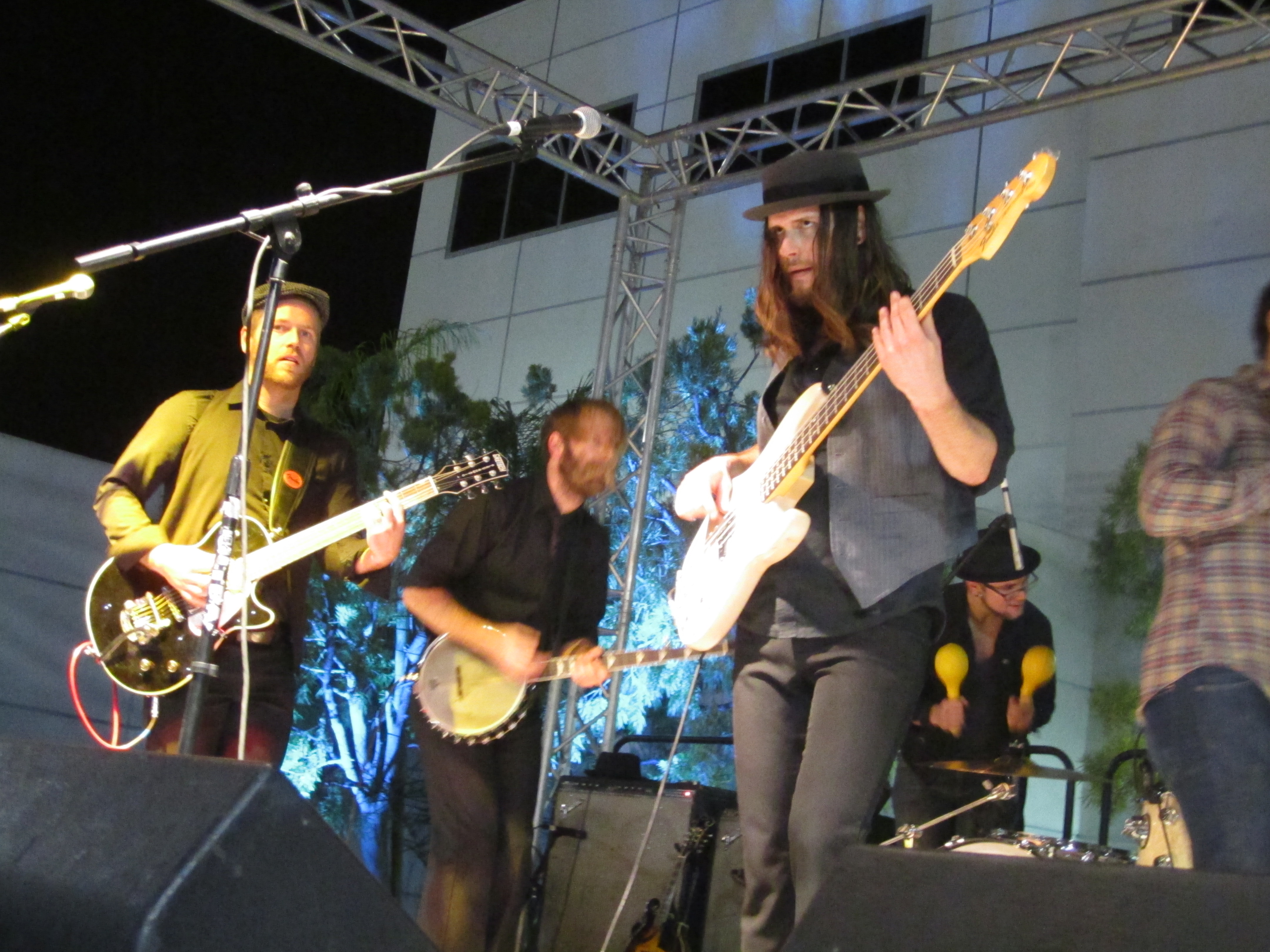 The Silent Comedy took on the night, jumping and dancing per usual but also in attempt to stay warm. Across the street at the neighboring dealers, lights from the car alarms twinkled like Christmas lights in the cold night air as the musical raucous shook up the PB community.